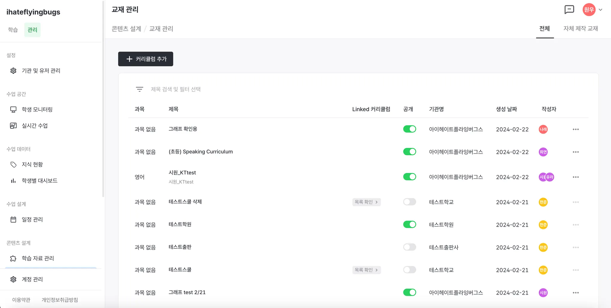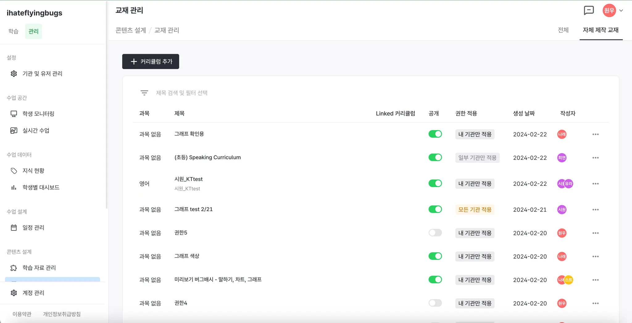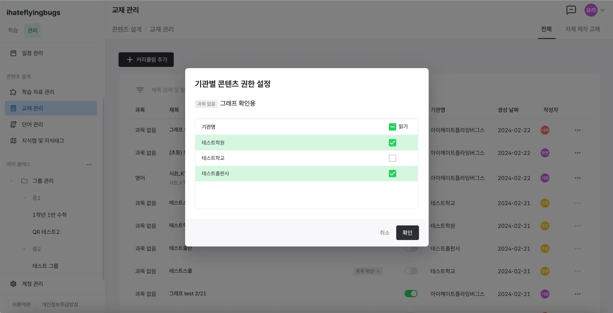 출판사나 ihateflyingbugs에서 자체 개발한 콘텐츠 및 교재를 특정 학교에게 읽기 권한으로 공유할 수 있습니다.
