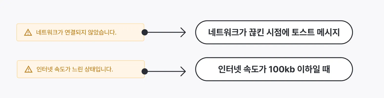 인터넷이 느릴 때, 끊켰을 때 B2C/LMS/CMS 우측 상단에 네트워크 토스트 알림이 뜹니다.