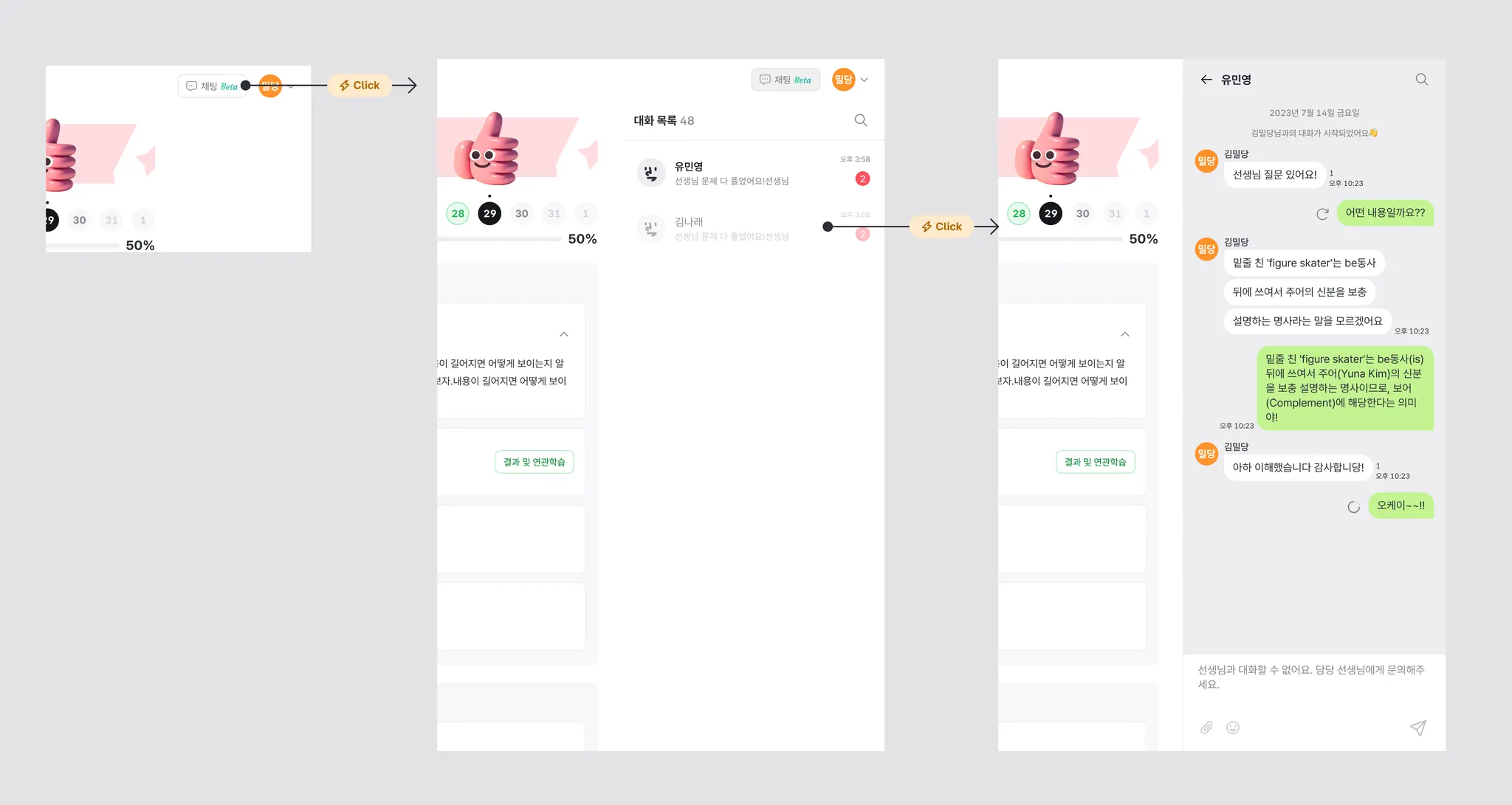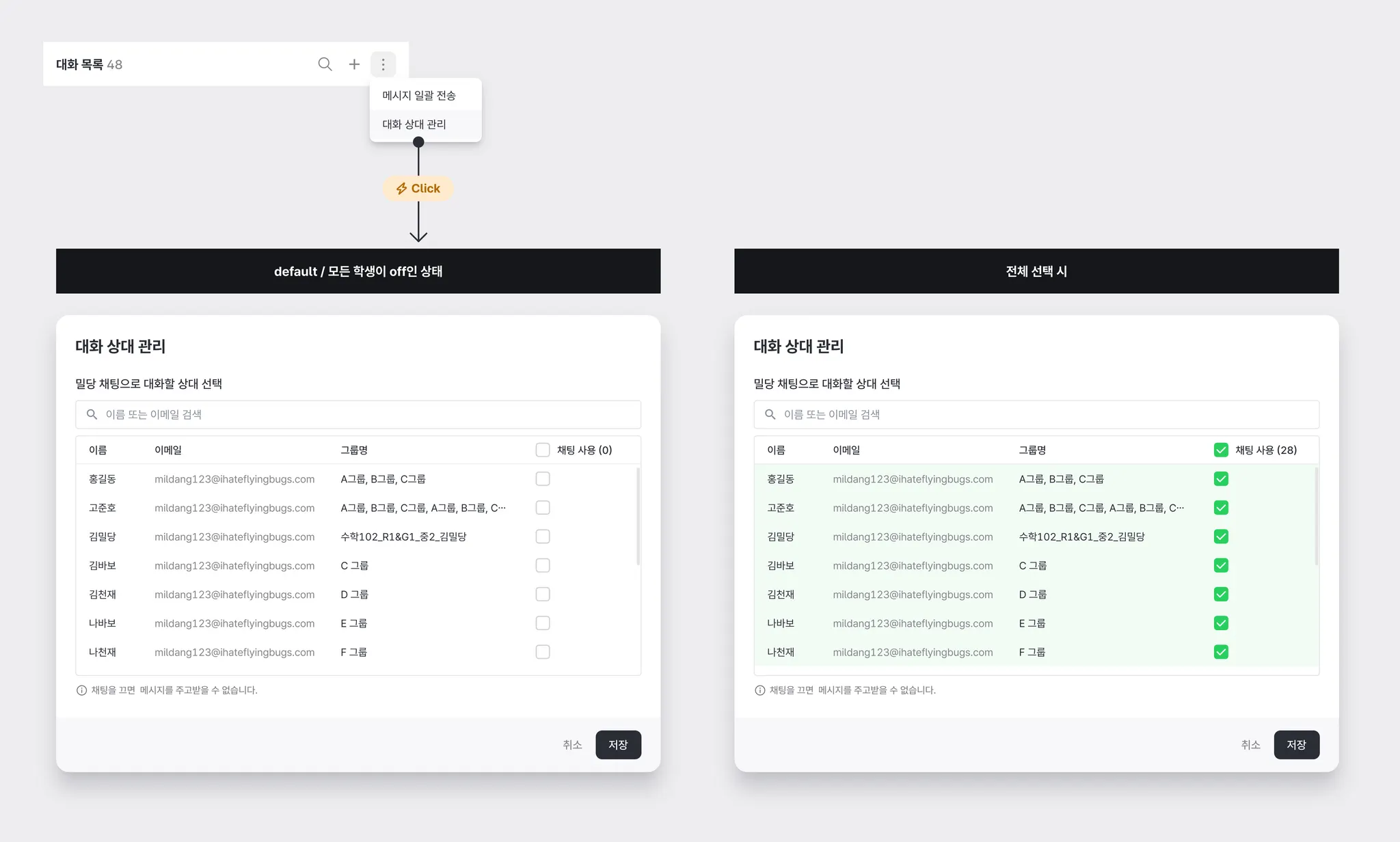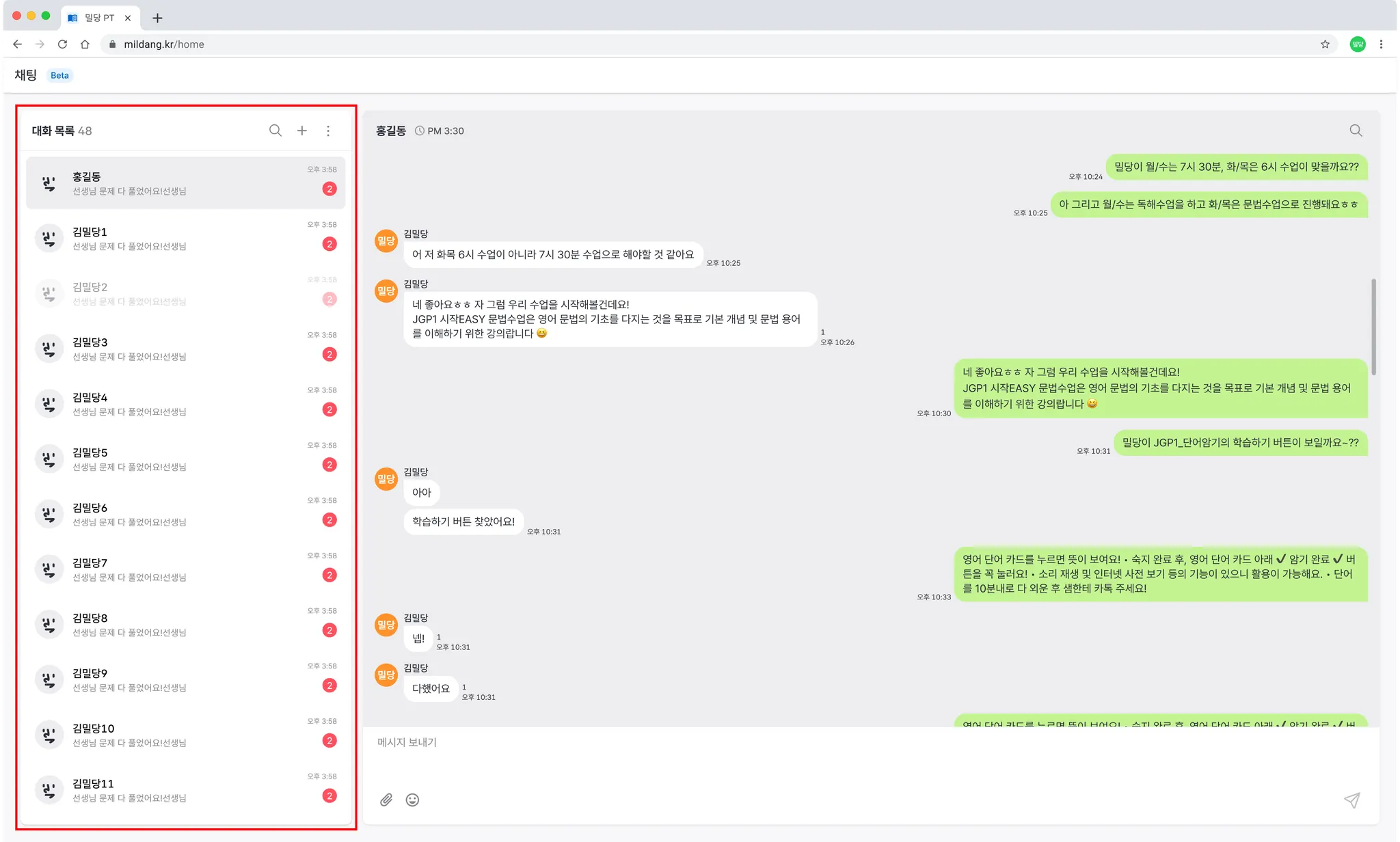 단, 그룹에 학생 사용자가 여러 명일 때는 학생 사용자 인원 수 대로 선생님 사용자와의 일대일 채팅방이 만들어집니다.