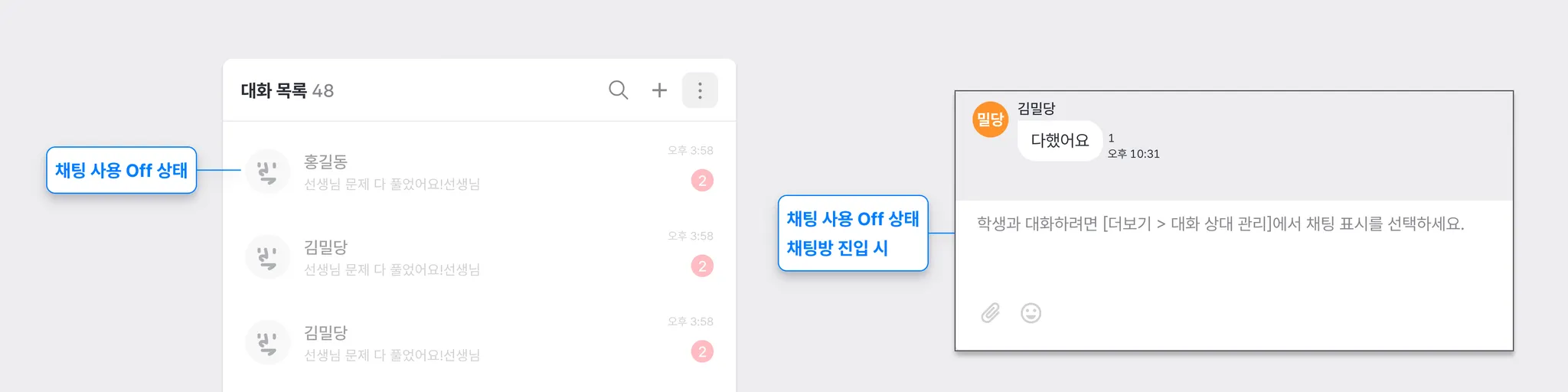 채팅 사용 대상이 아닌 학생들의 대화 목록은 아래와 같이 회색으로 표시됩니다.