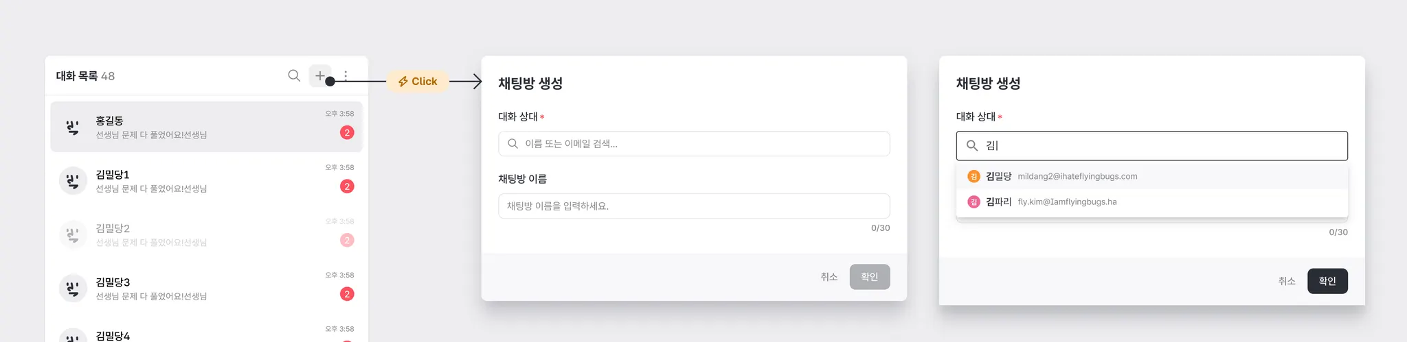 채팅 페이지에서 대화 목록 우측 상단에서 [+ 버튼]을 선택하세요.