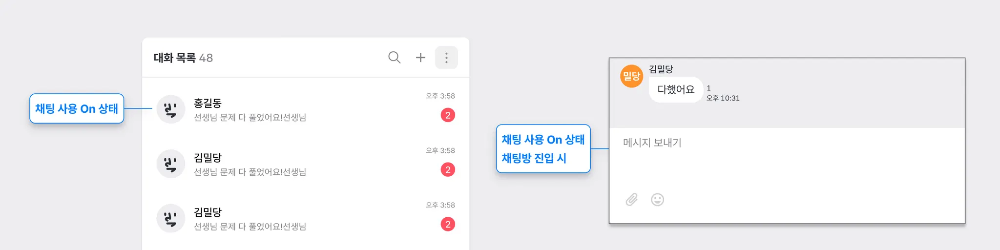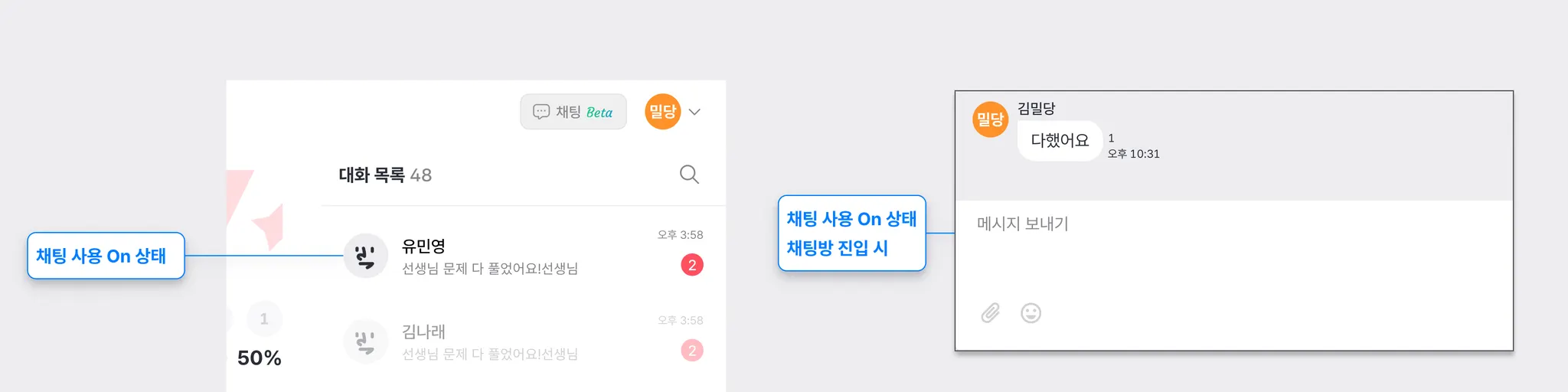 선생님이 채팅 사용기능을 킨 경우에만 밀당 채팅으로 메시지 보내기가 가능해집니다.