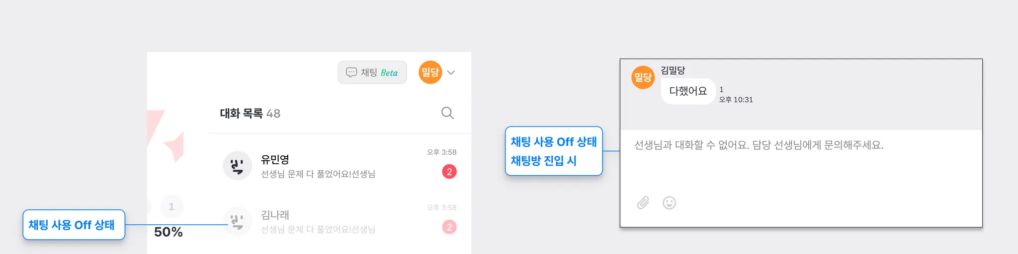 off한 선생님과는 더이상 밀당채팅 메시지를 주고받을 수 없습니다.