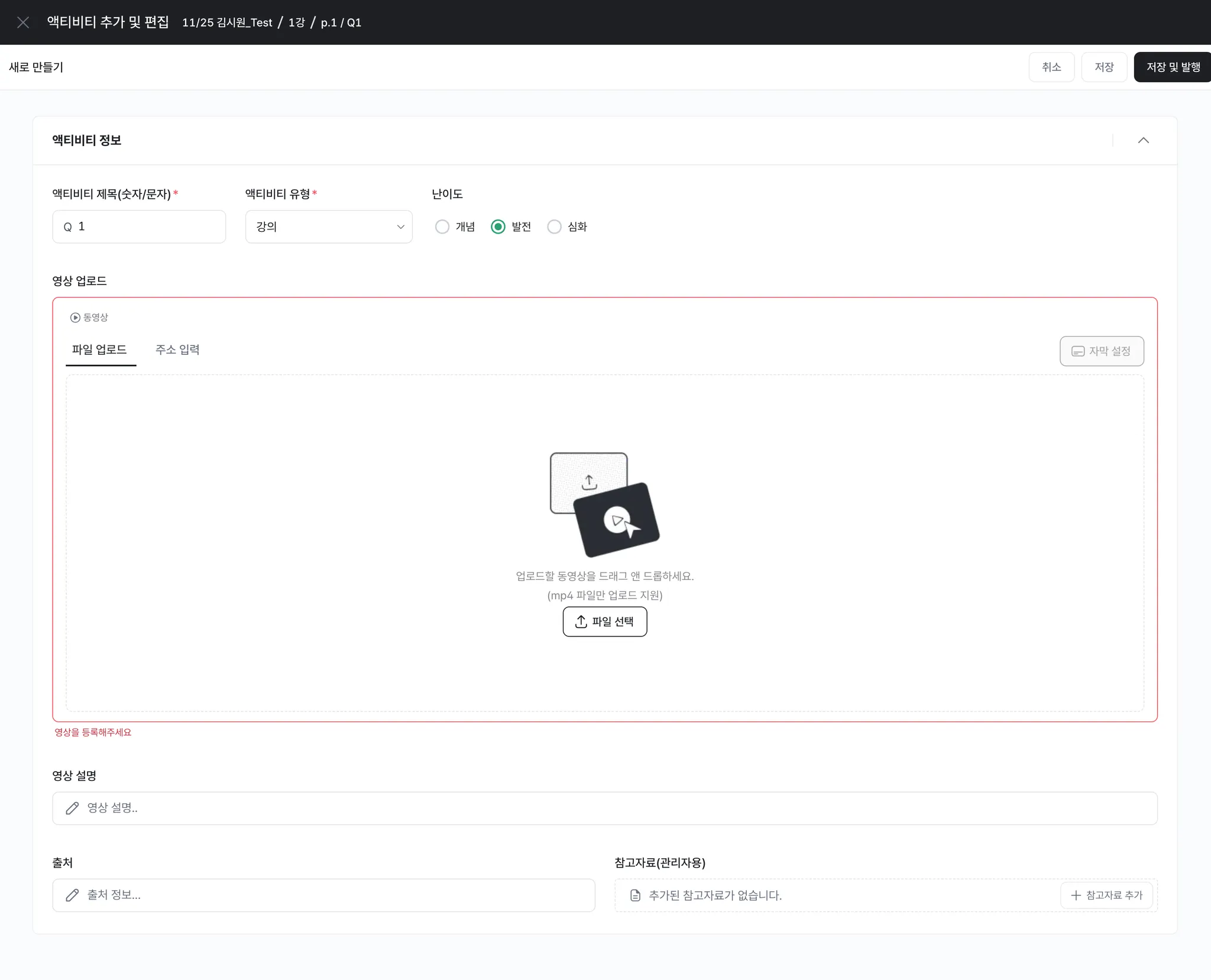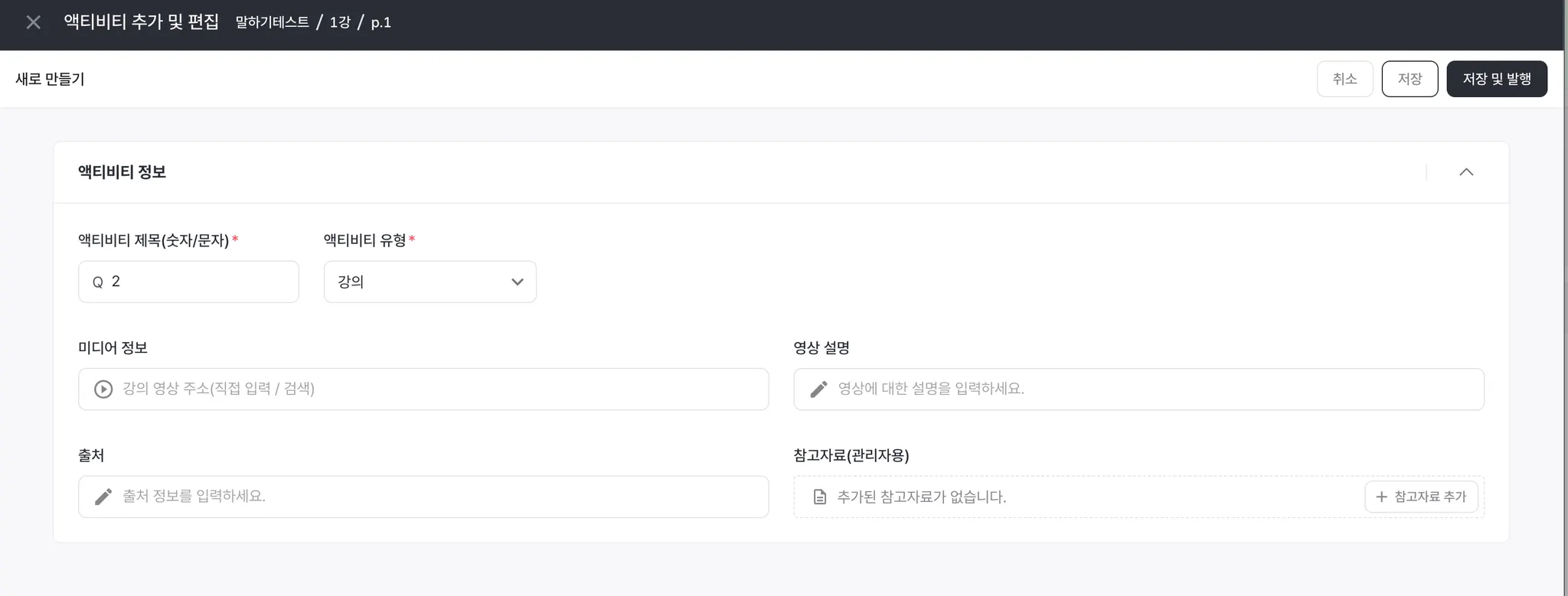 이후는 기존과 동일하게 나머지 정보를 입력 후 저장 또는 발행을 해주시면 액티비티가 추가 됩니다.