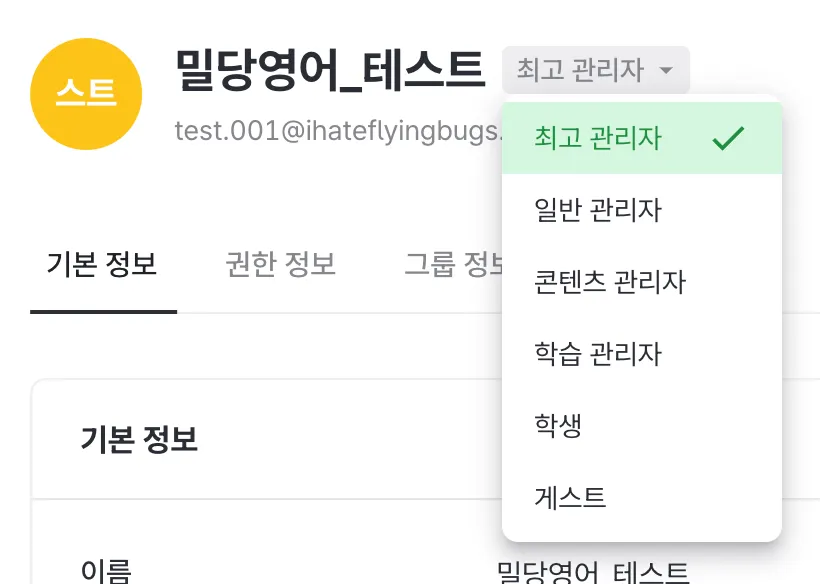 일반 관리자 : CMS LMS STUDENT → 그 외 사내 유저 (이메일이 ihateflyingbugs.com인 유저)
