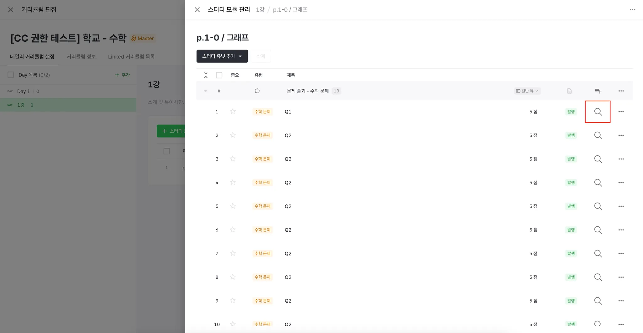 (돋보기 영역이 아닌 타이틀/유형/배점/발행여부 열은 선택해도 동작하지 않습니다.)