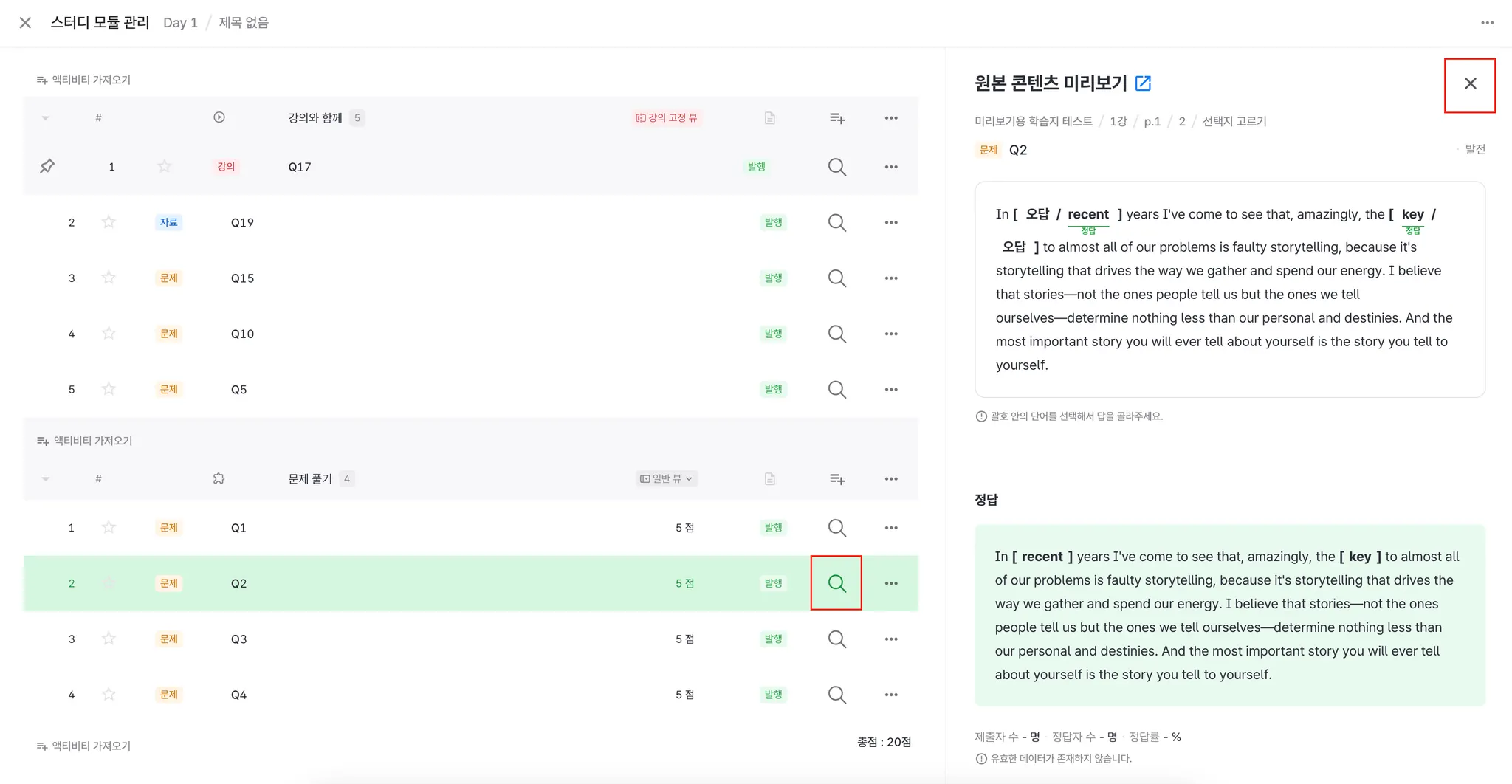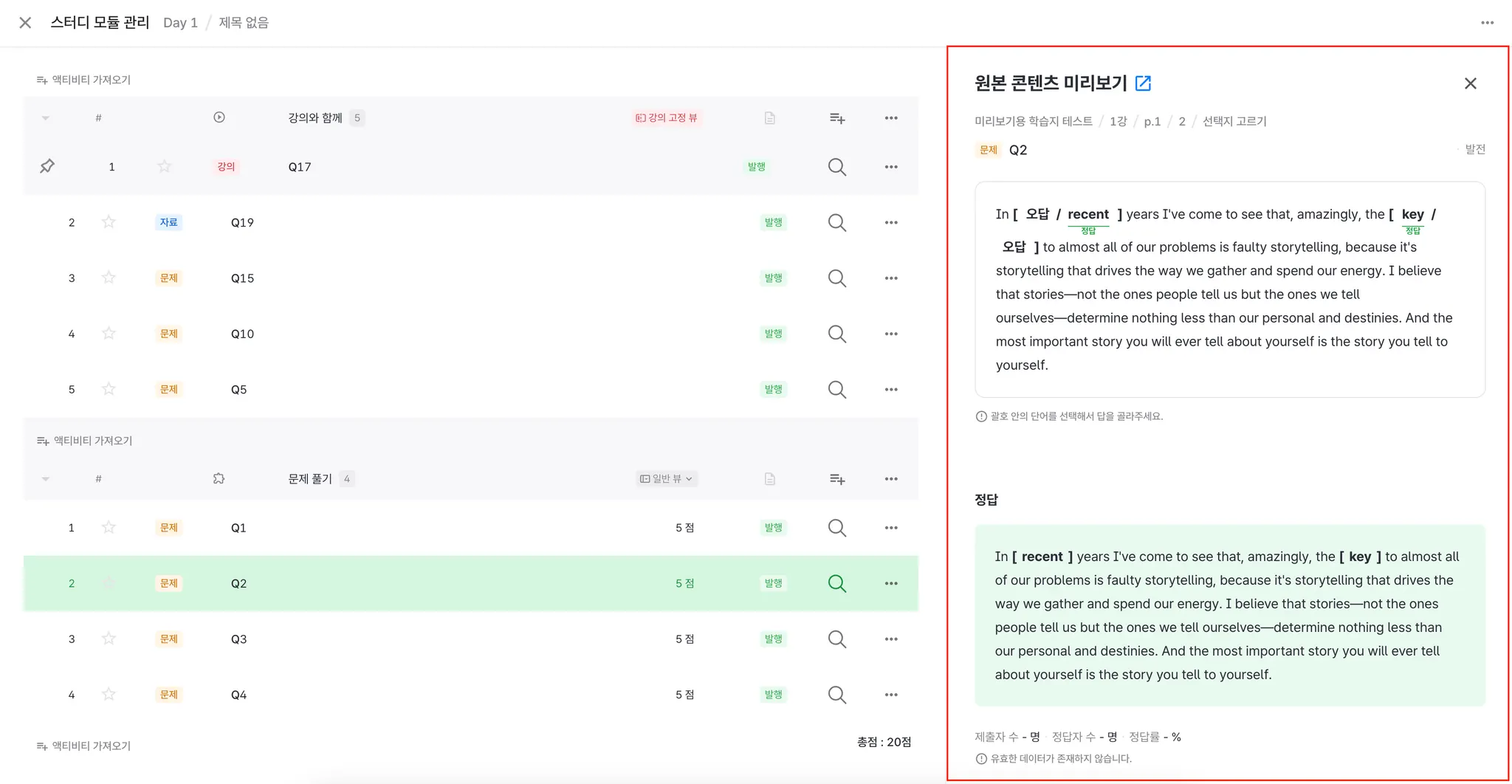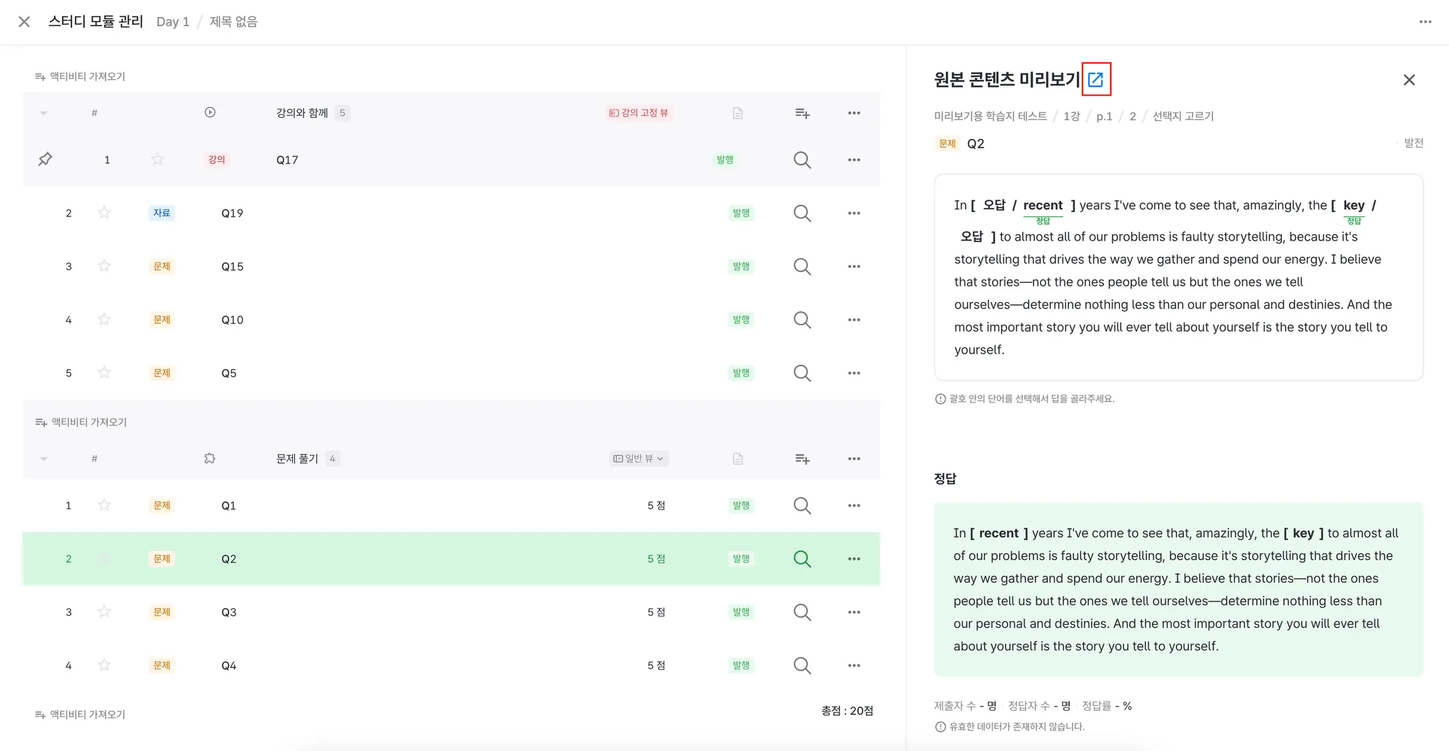 : 기존에는 SU에 추가한 뒤, 각 SA가 어떤 액티비티인지 확인하려면 원본 콘텐츠로 새탭에서 확인할 수 있었는데, 이제는 같은 화면에서 상세 문제화면을 확인할 수 있게 되어, 커리큘럼 구성 시 검수작업을 하는데 도움이 될 것으로 기대합니다.