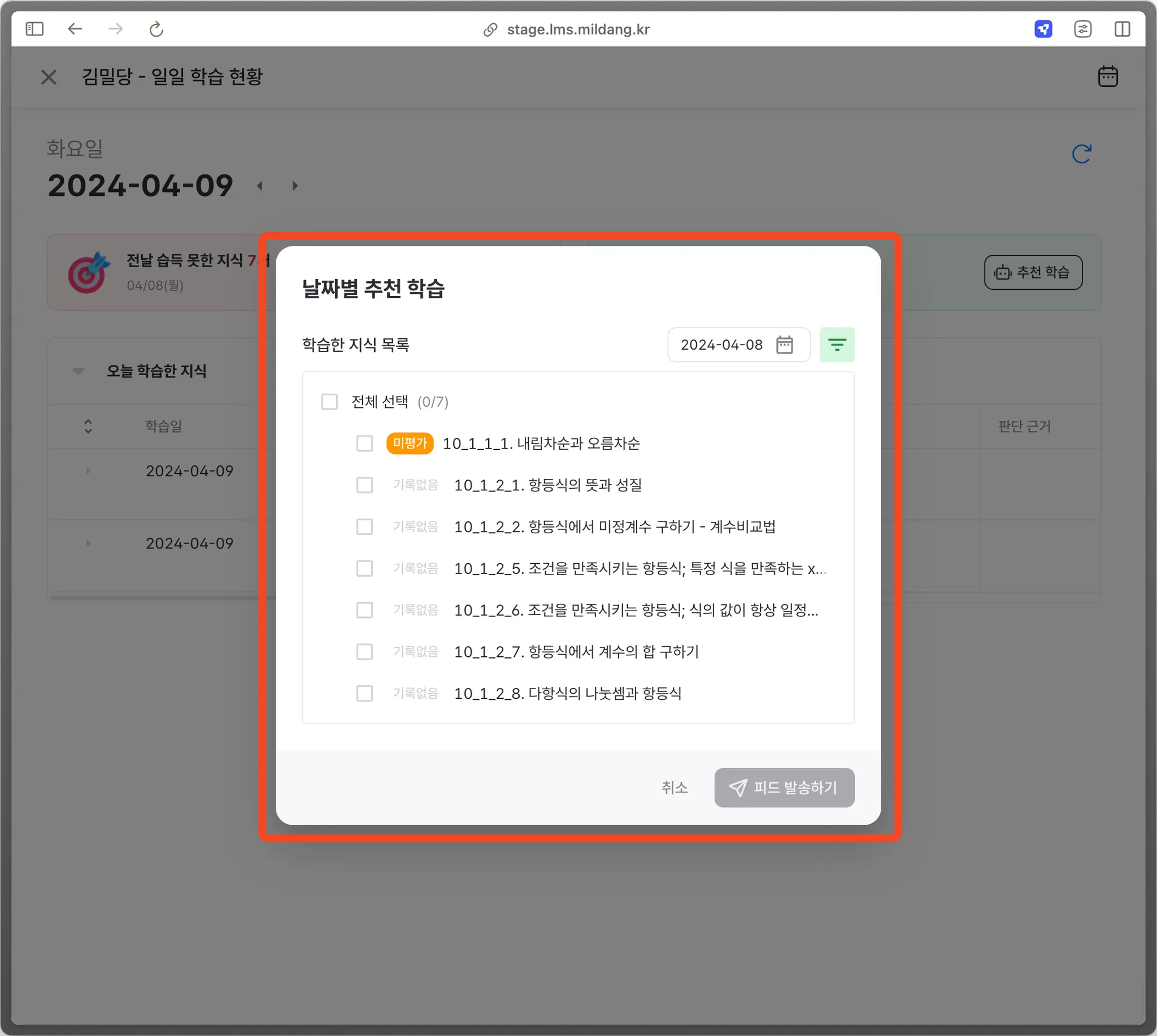 지식태그별 상세 학습 기록 확인 불가