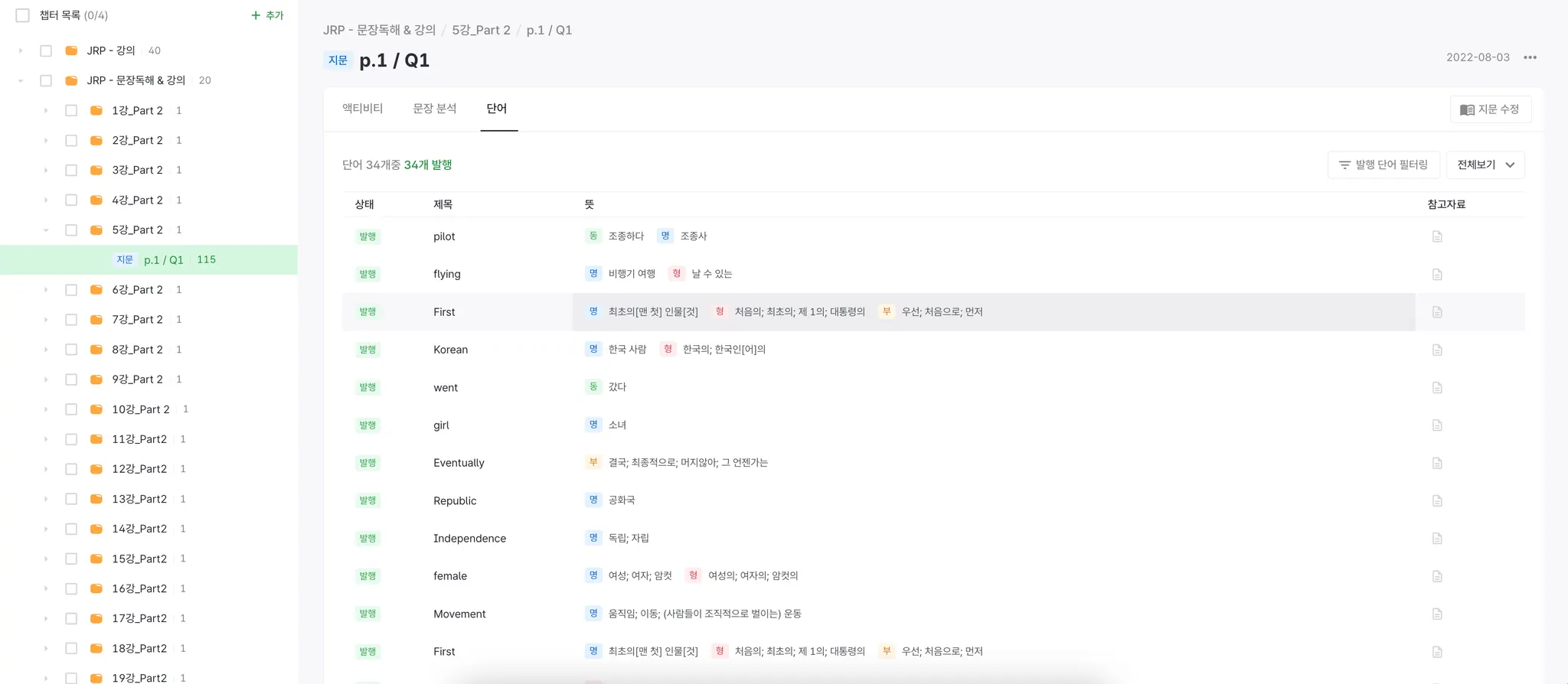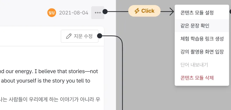 이제는 기존에 콘텐츠 모듈 페이지에서 바로 문장 분석, 단어관리를 할 수 있어요.