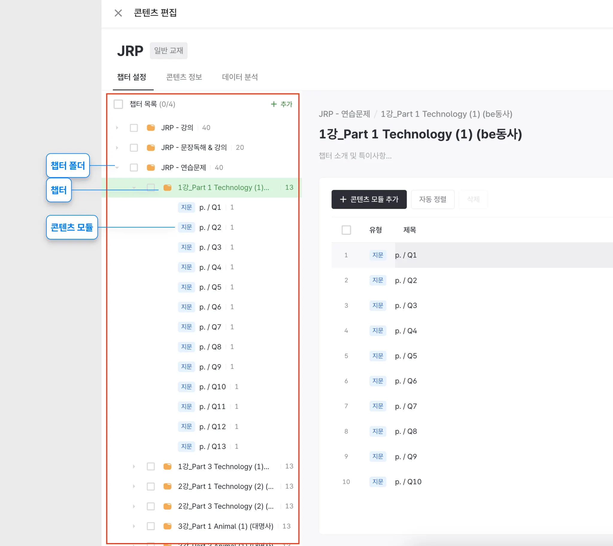 챕터 폴더 / 챕터 / 콘텐츠 모듈을 확인할 수 있습니다.