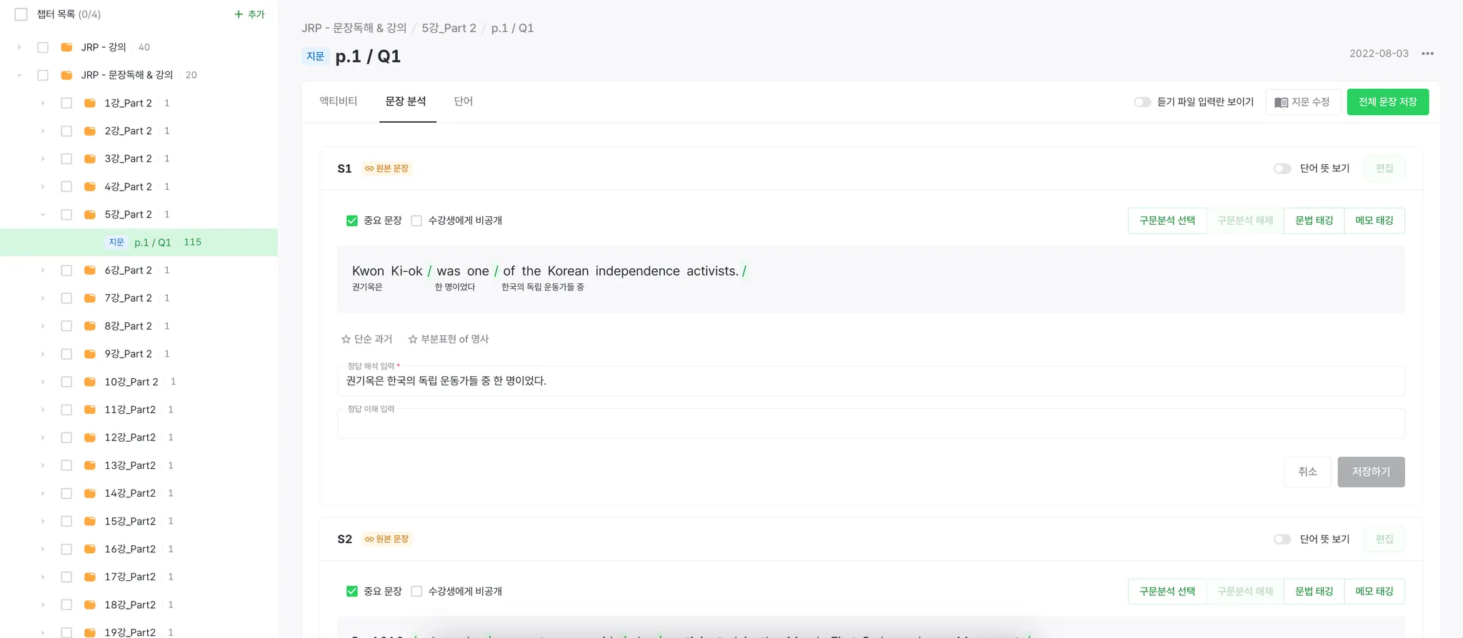 +) 문장 문석에서 문장 수정 내용을 한번에 저장할 수 있는 [전체 문장 저장]버튼이 생겼어요!!