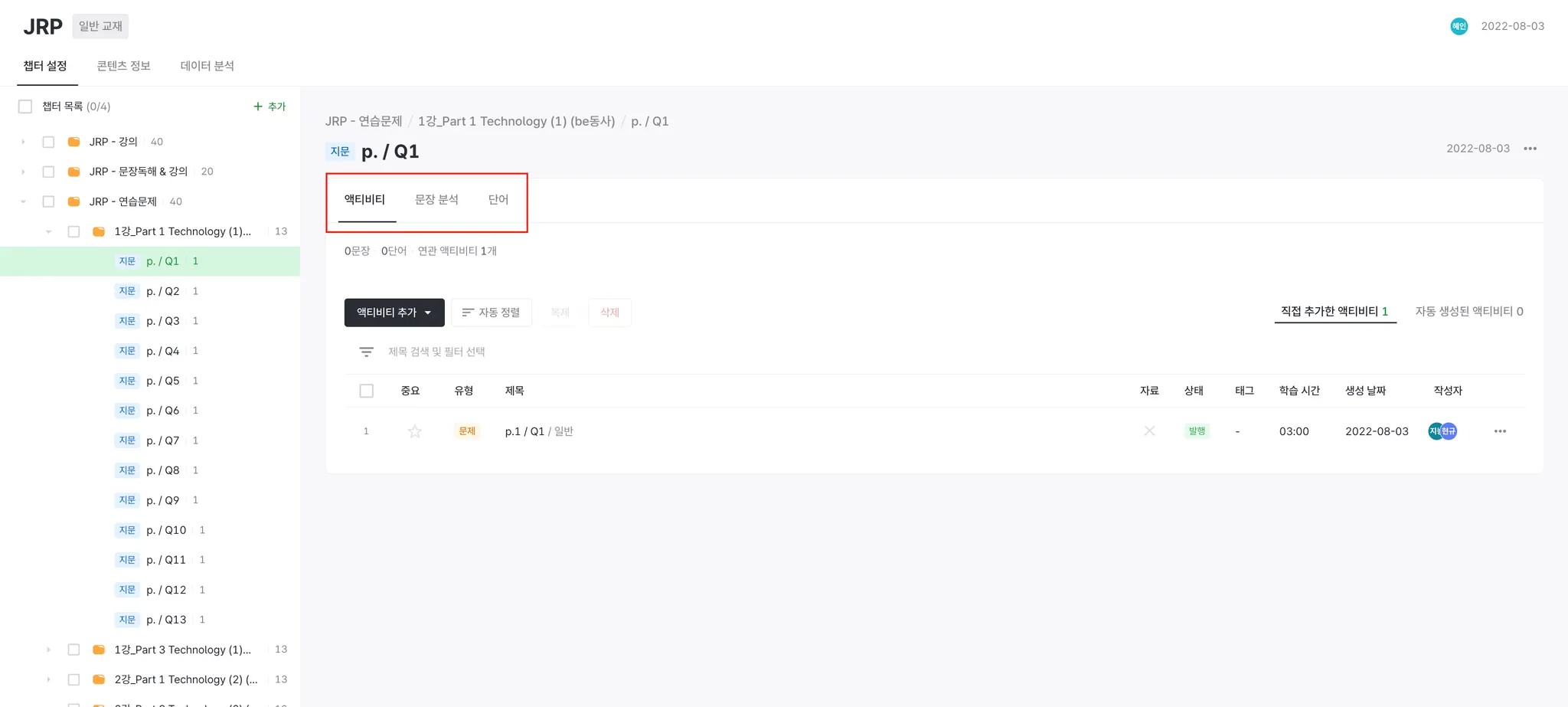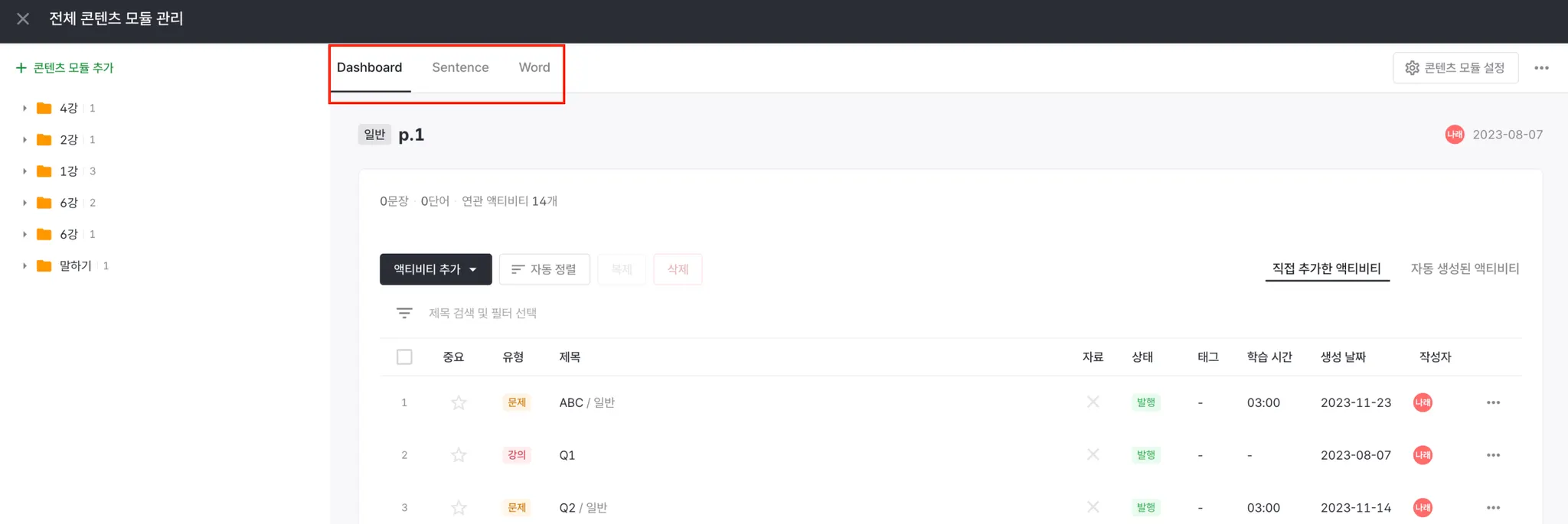 기존 전체 콘텐츠 모듈 관리에서 문장 분석, 단어 관리를 할 수 있었습니다.