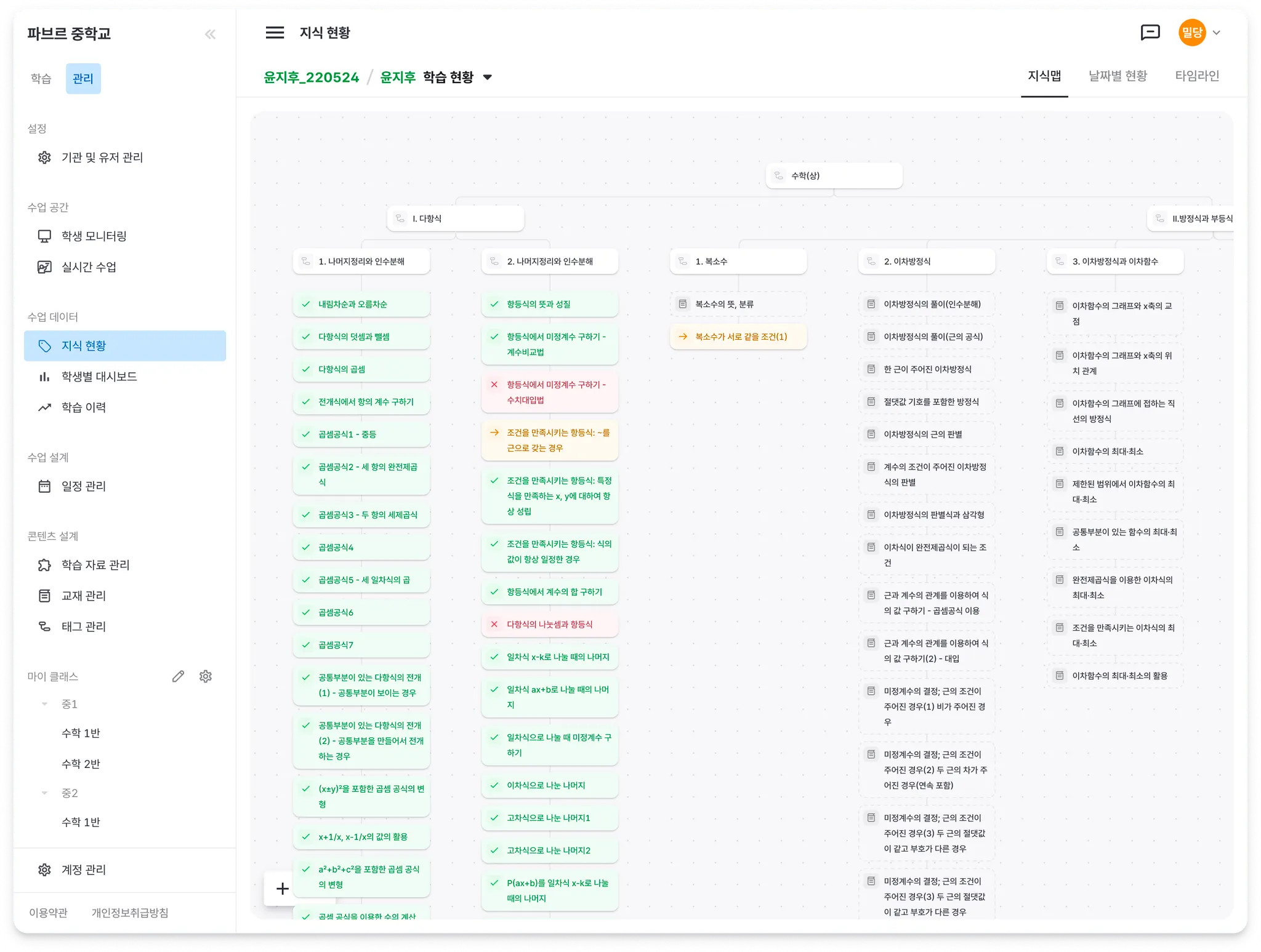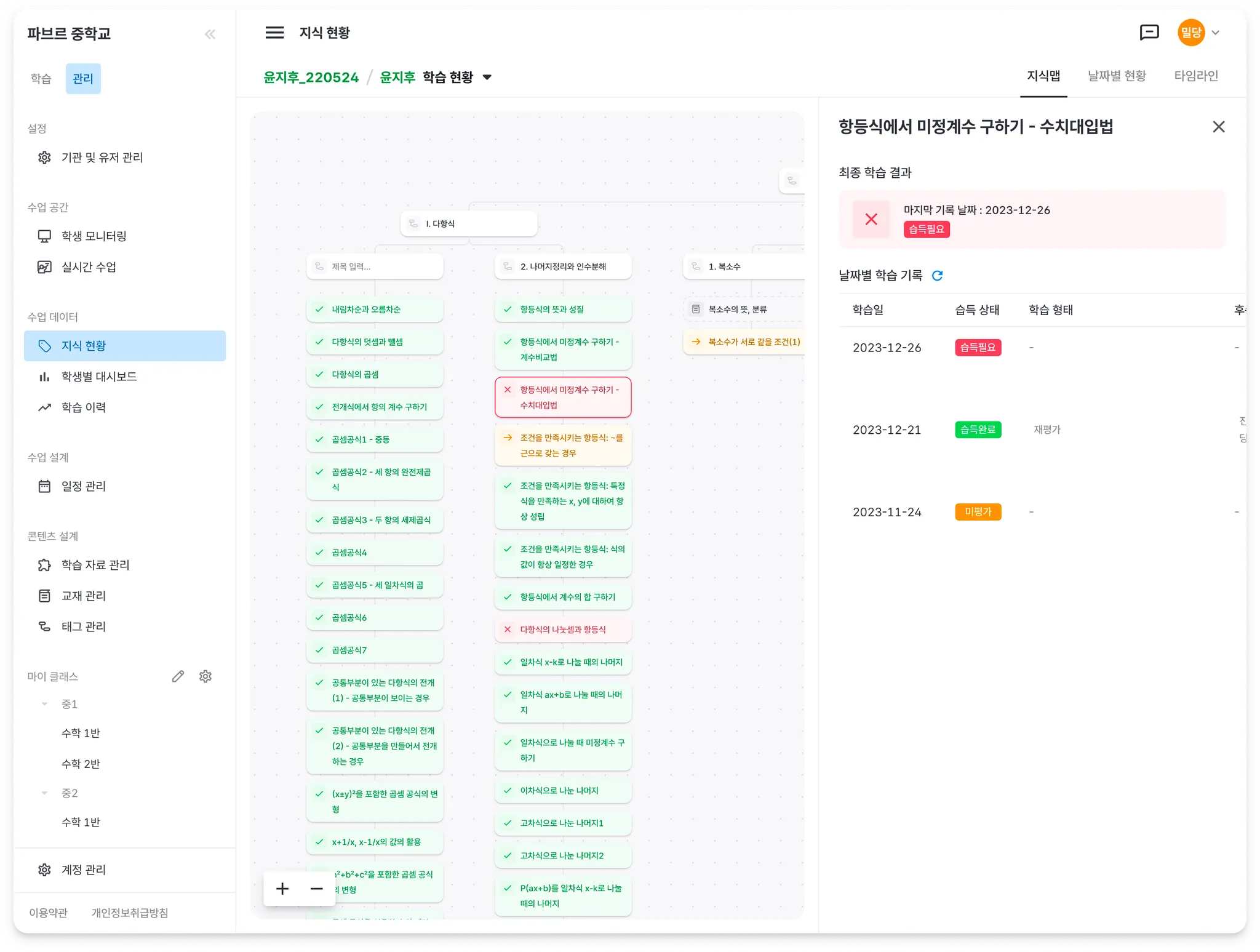 추후, 학생의 지식습득 현황을 순서도 형태로 확인할 수 있는 ‘유저 지식맵 대시보드’이 출시될 예정입니다. 조금만 기다려 주세요