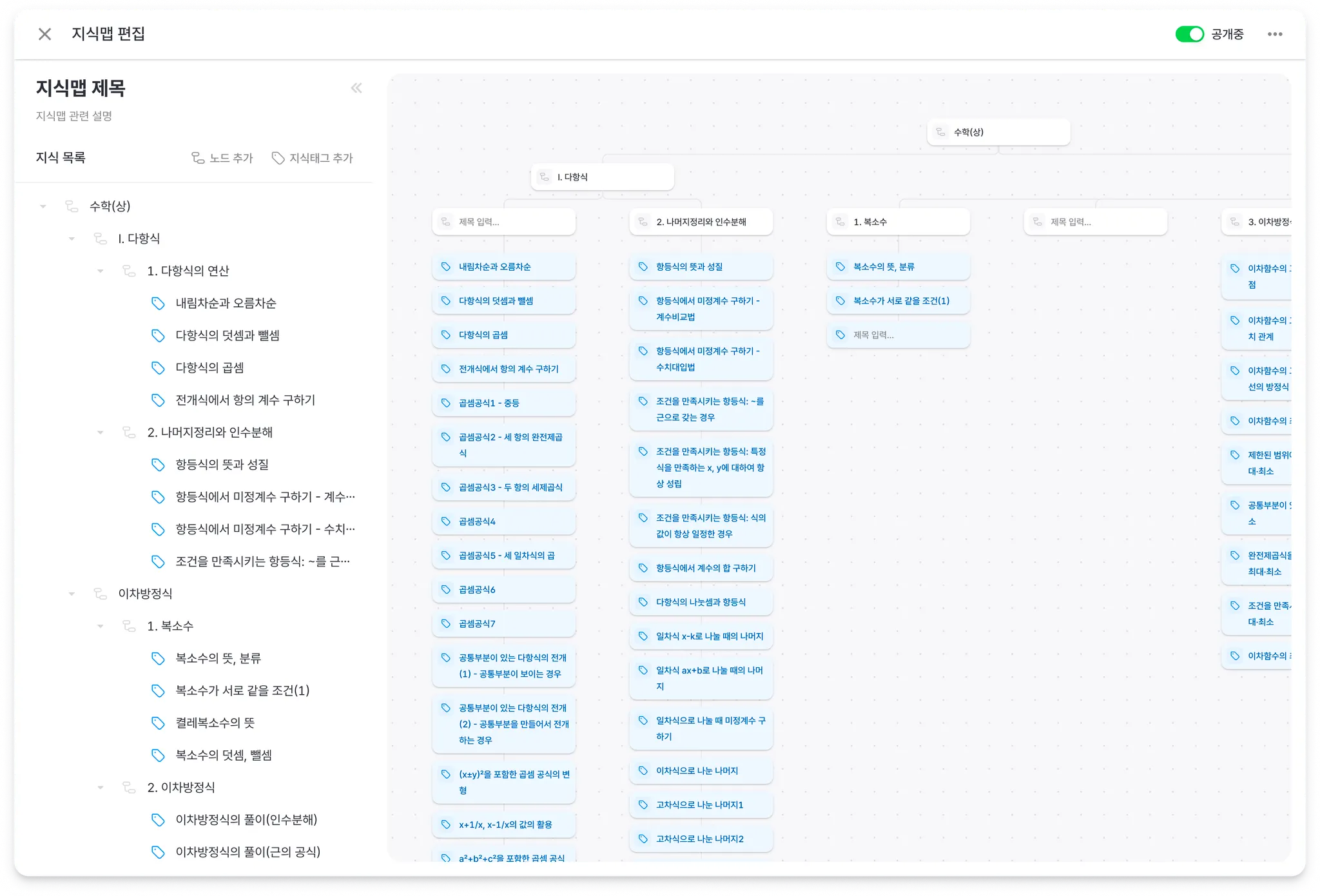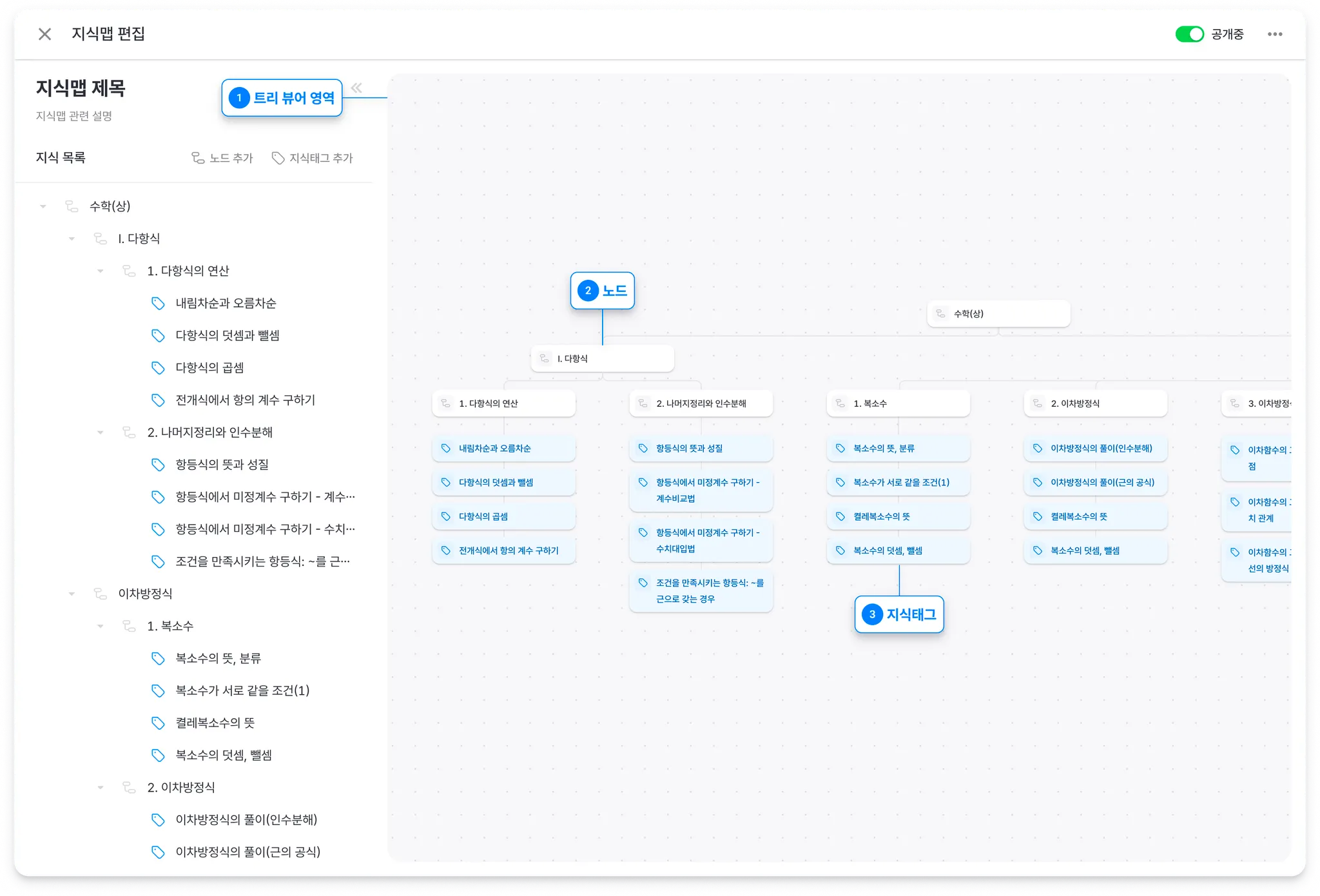 좌측 트리 영역에 추가된 지식태그를 기반으로 그려집니다.
