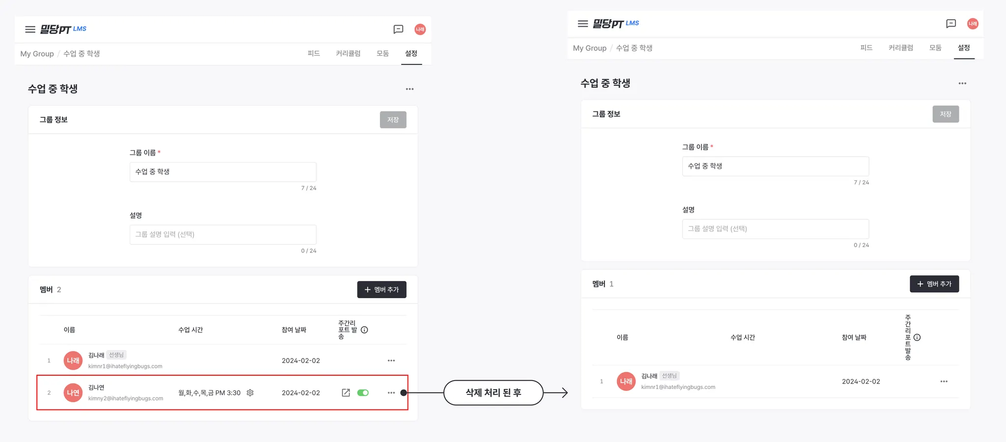 선생님이 해당 학생의 그룹을 가지고 있었다면, 학생이 그룹에서 없어지게 됩니다.