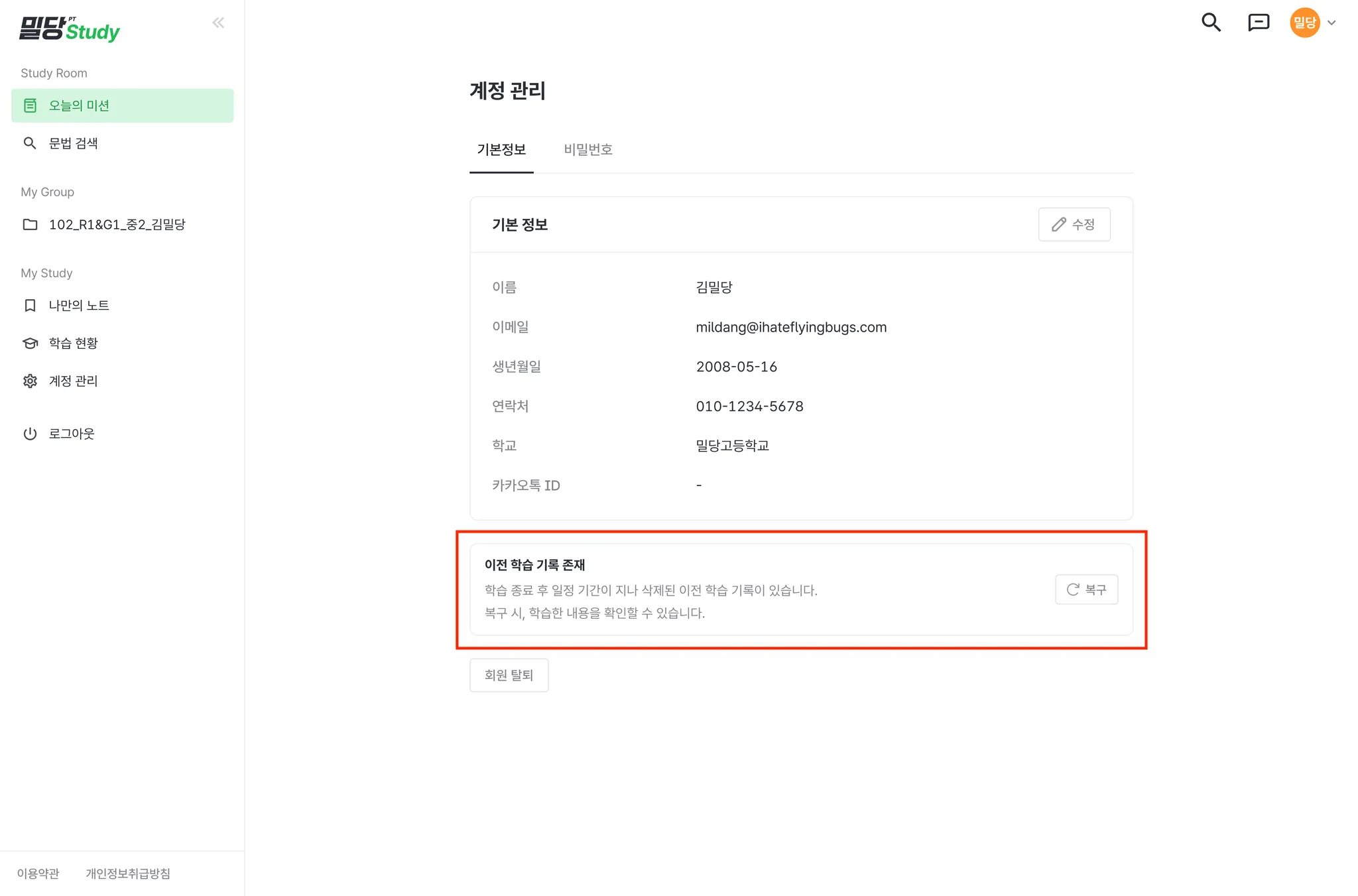 : 밀당 접근 권한 만료(≒ 종강) 후 3개월이 지났고, 3개월동안 학습 기록이 아예 없는 학생들의 이전 학습 기록이 지워집니다. 그러나 학생이 다시 밀당으로 돌아왔을 때, 기존 데이터를 확인하고 싶다면 복구할 수 있는 기능이 도입됩니다.
