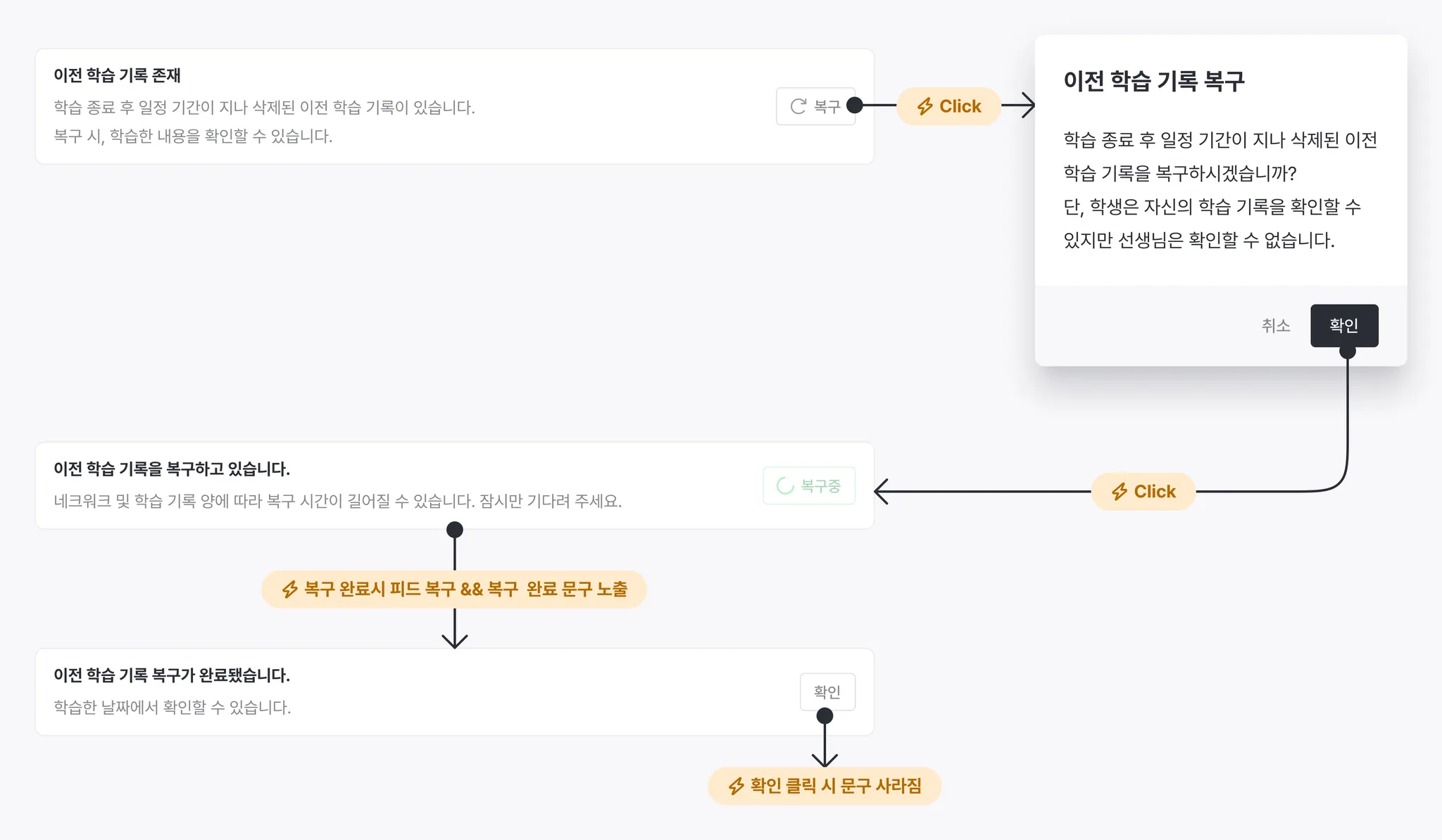 복구 완료 시, 학생은 오늘의 미션 페이지에서 이전 날짜로 돌아가 이전에 학습했던 피드 기록을 확인할 수 있습니다.