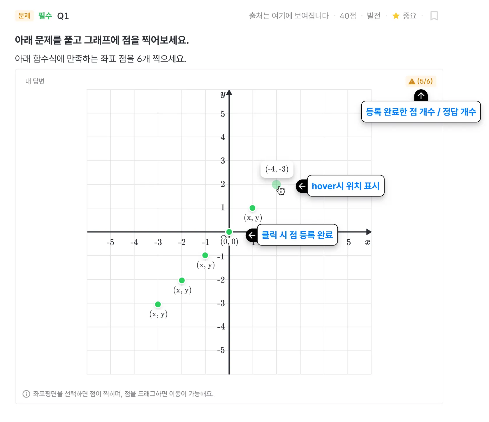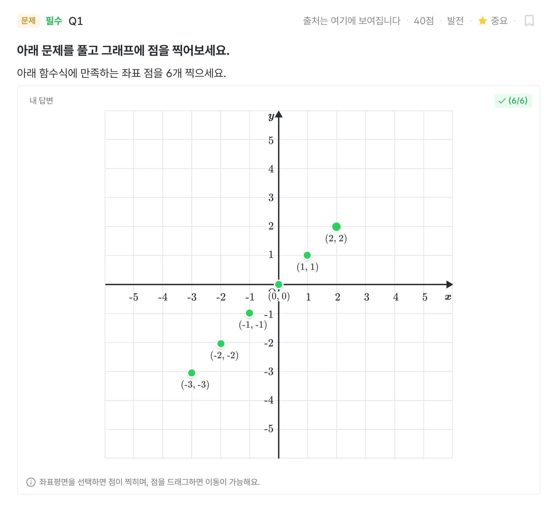 그래프 SA의 종류는 지속적으로 추가될 예정이며 1차로 [좌표 구하기] 유형, 2차로 [그래프 그리기] 유형이 추가될 예정입니다. 사용해보시면서 적극적인 피드백 공유주시면 추후 개선하며 다음에 예정된 유형 추가와 함께 반영할 수 있도록 노력하겠습니다!!