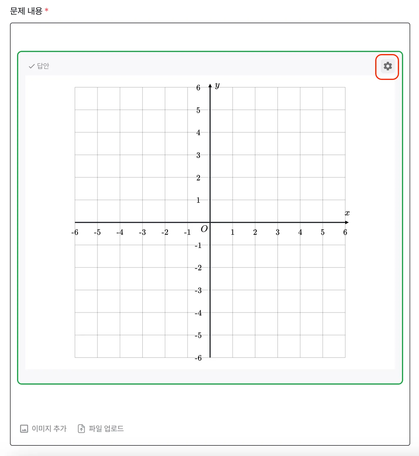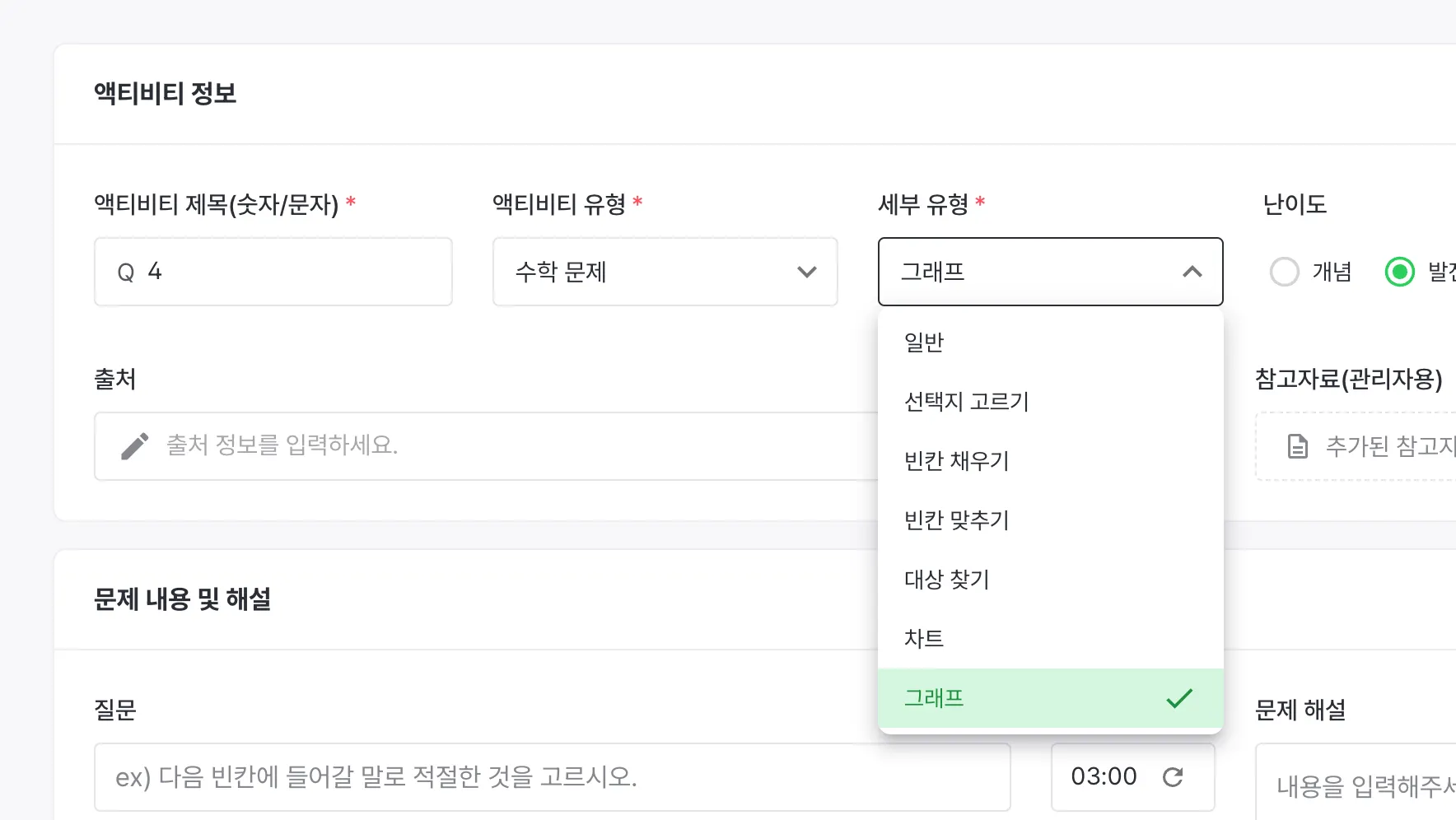 액티비티 추가 및 편집 페이지에서, [수학 문제] 유형 선택 후 세부 유형에서 “그래프” 타입을 선택합니다.