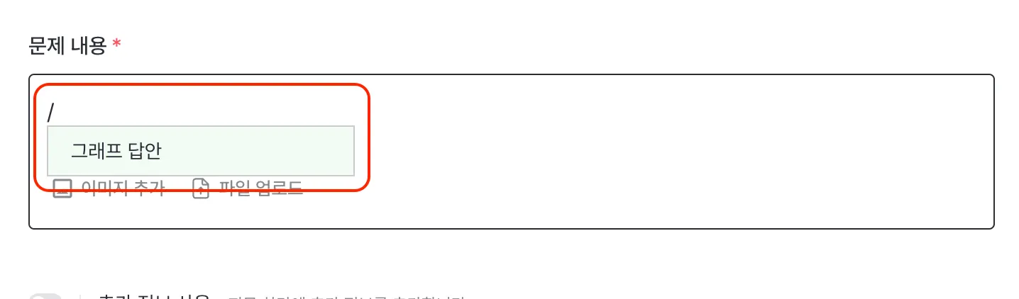 문제 내용 영역에 “/”를 입력하면 [그래프 답안]이라는 메뉴가 보입니다. 이 메뉴를 선택합니다.