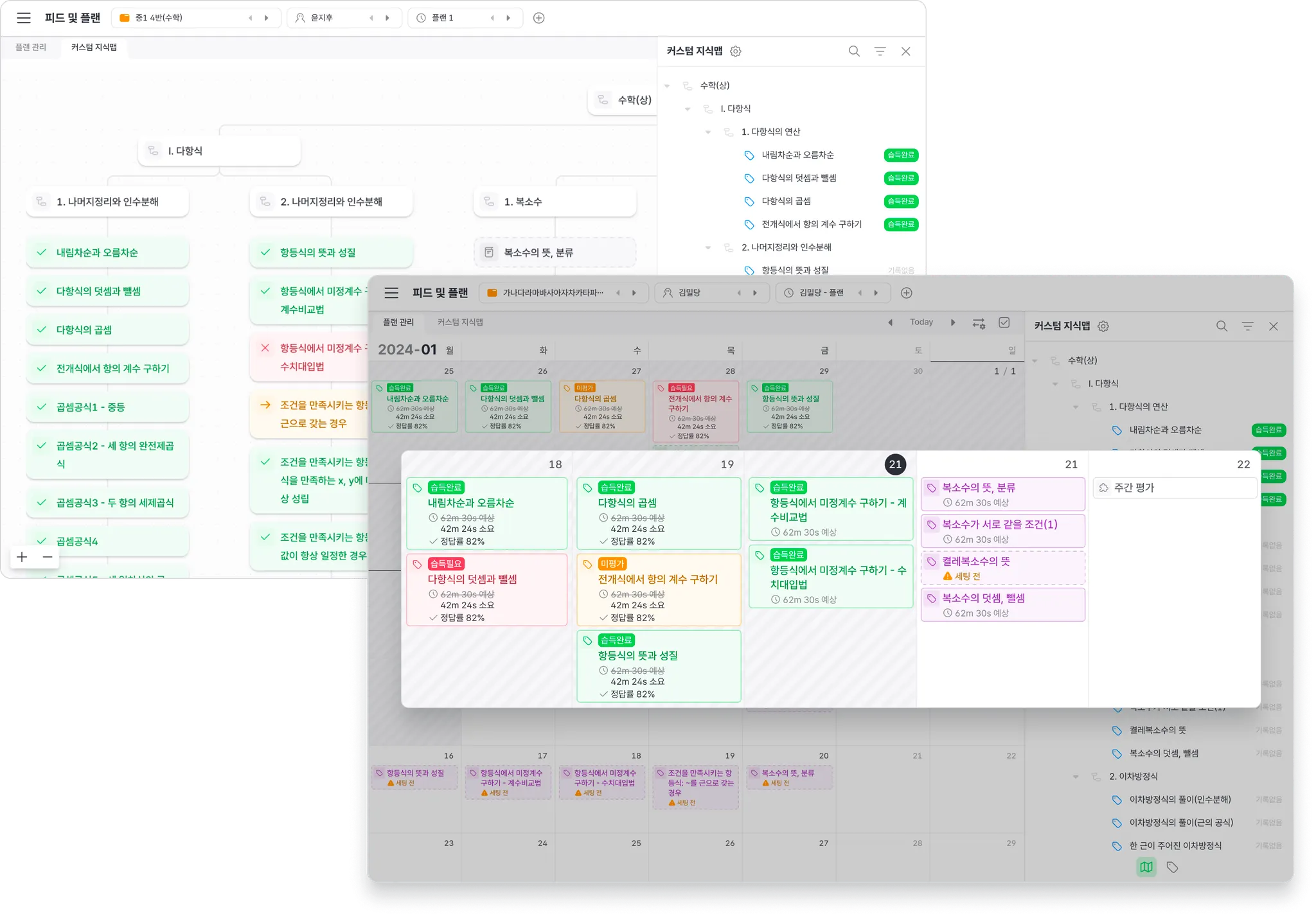 플랜 기능을 통해 지식태그 기반으로 학생이 수행해야 하는 학습을 계획하고, 진도를 관리할 수 있습니다.
