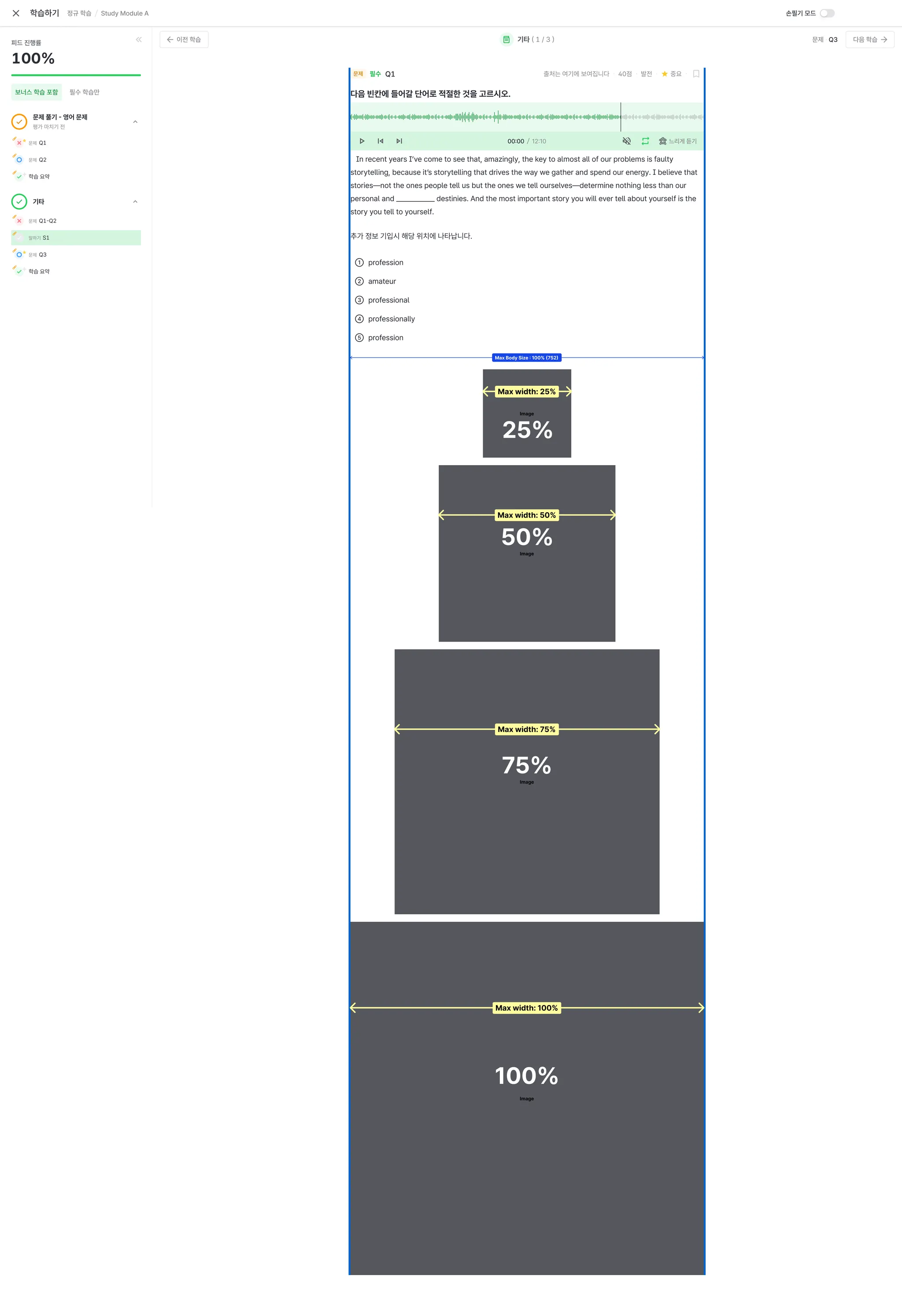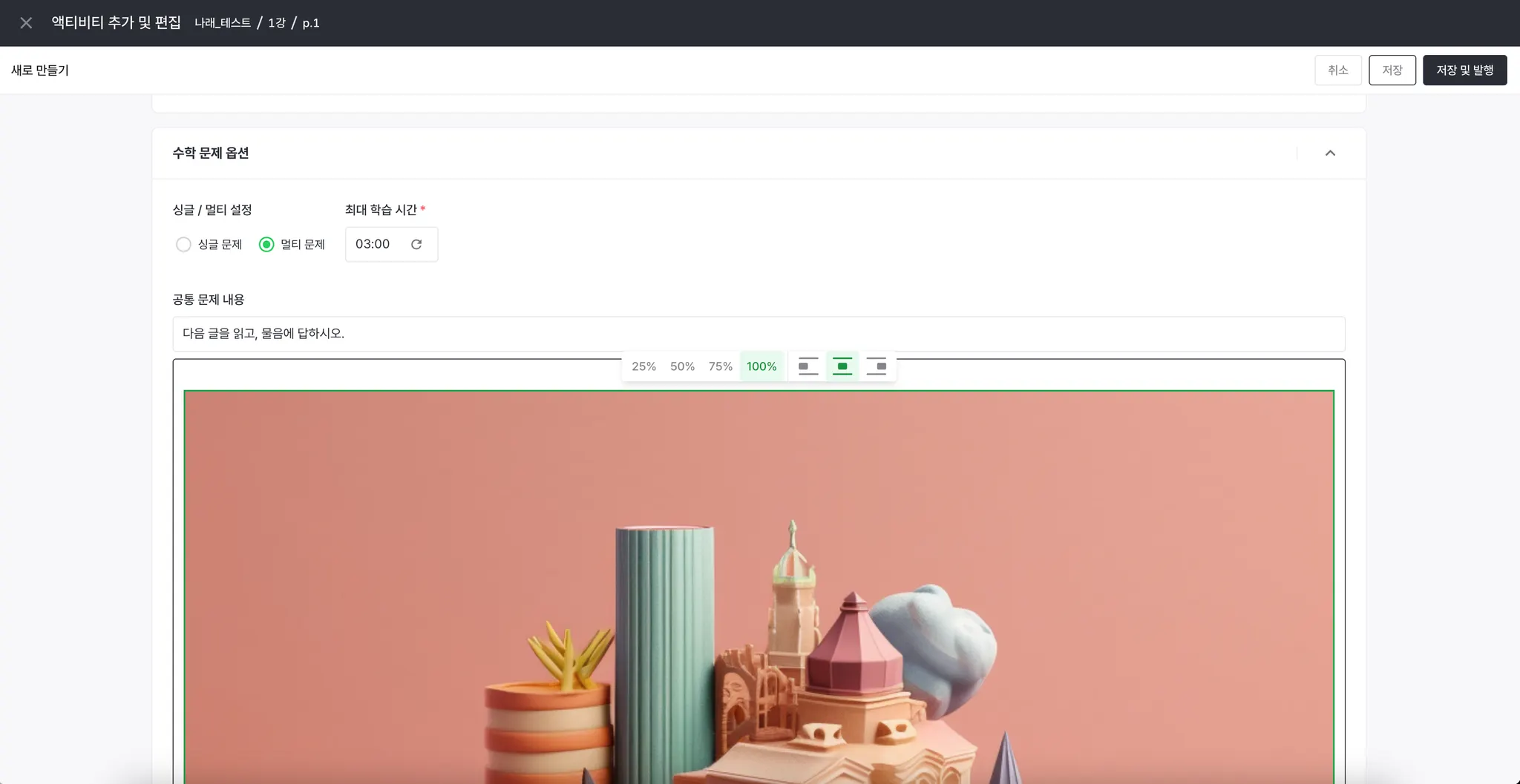 멀티문제의 공통 문제 내용에 이미지를 추가했을 때는 해당 에디터 영역의 width(가로길이)를 기준으로 보여집니다.