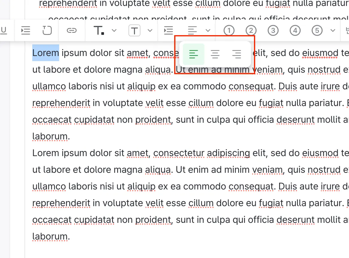 기본은 왼쪽 정렬이며, 드래그 영역이 포함된 문단에 정렬 설정이 적용됩니다.