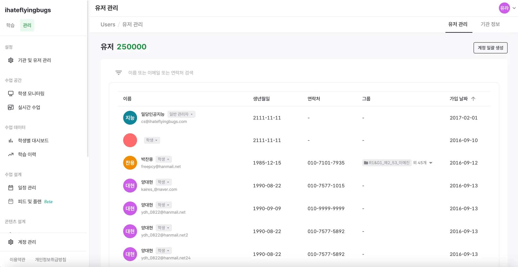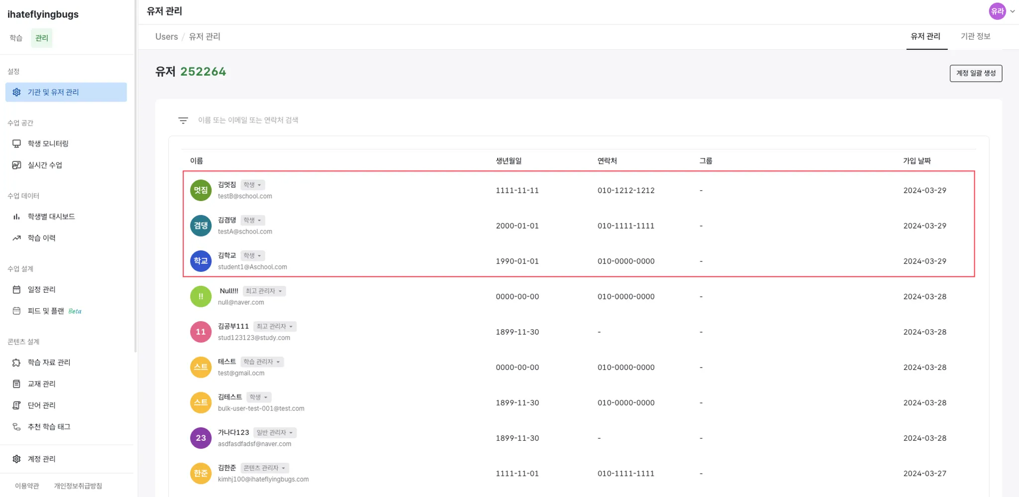 기관 및 유저 관리 페이지에서 “계정 일괄 생성”을 클릭합니다.
