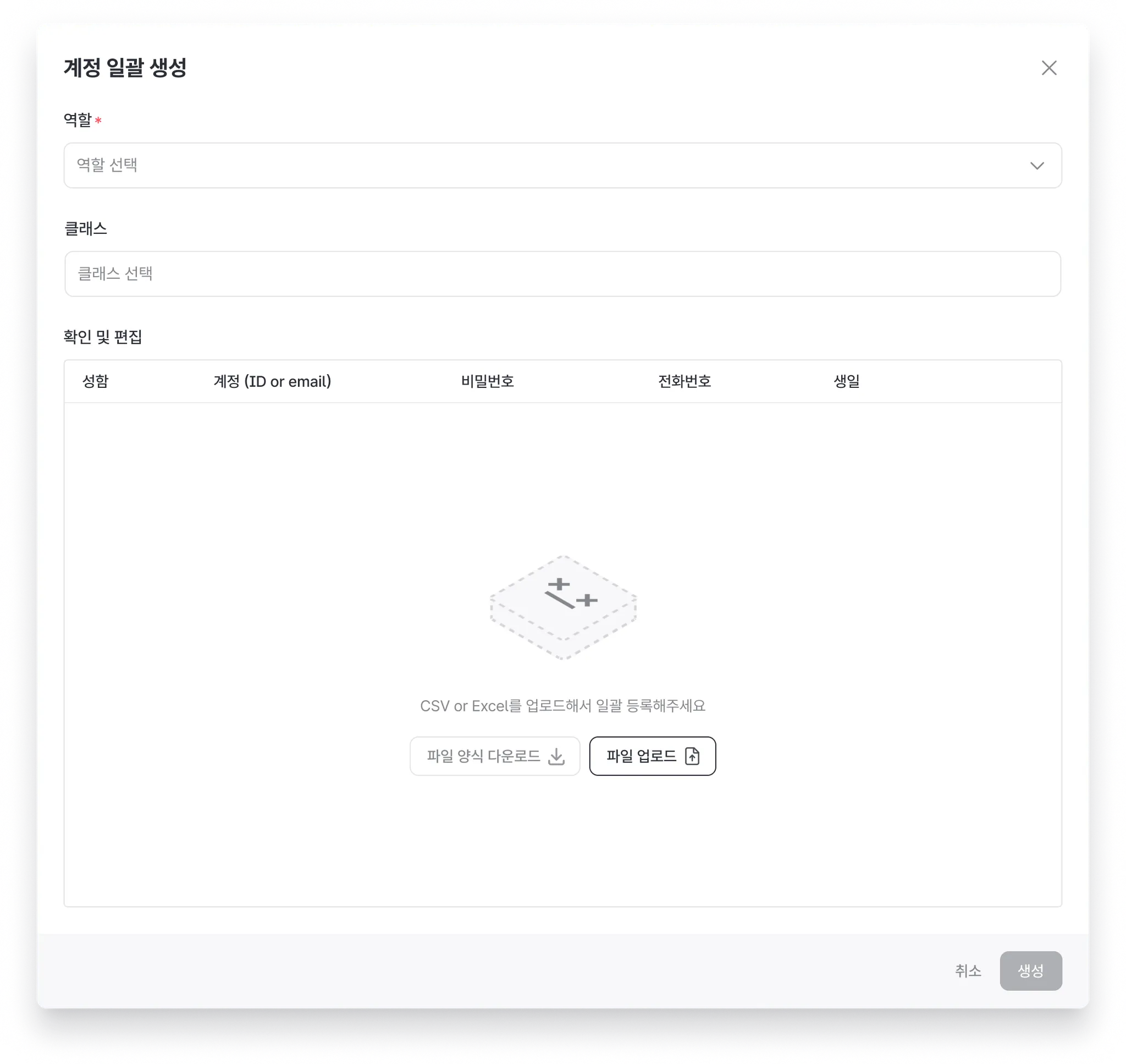 계정 일괄 생성을 클릭했을때 나오는 모달창에서 “파일 양식 다운로드” 버튼을 클릭합니다.
